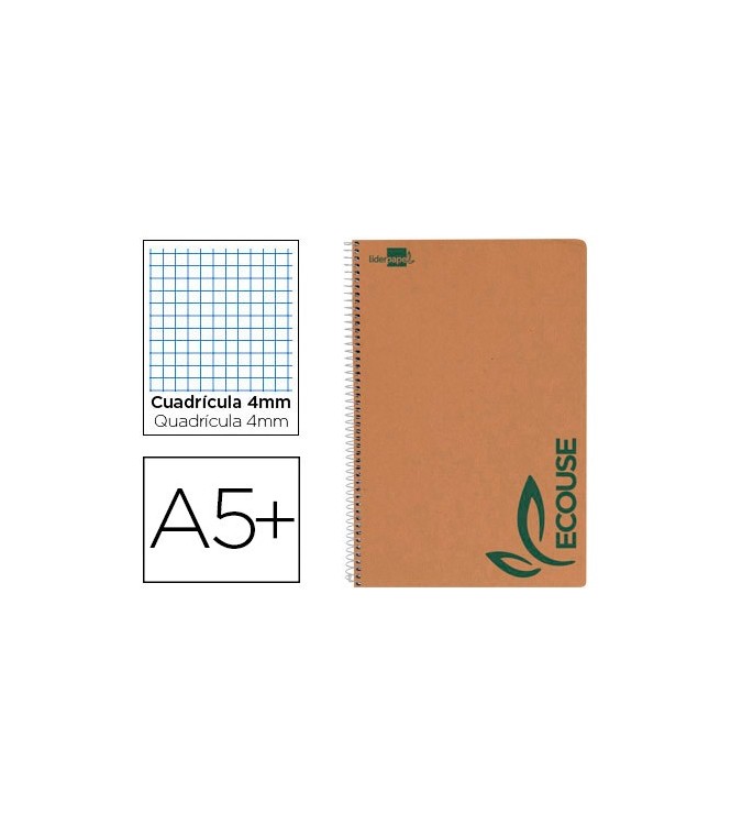 Cuaderno espiral liderpapel folio ecouse tapa cartulina kraft 80h papel reciclado 60 gr cuadro 4mm con margen.