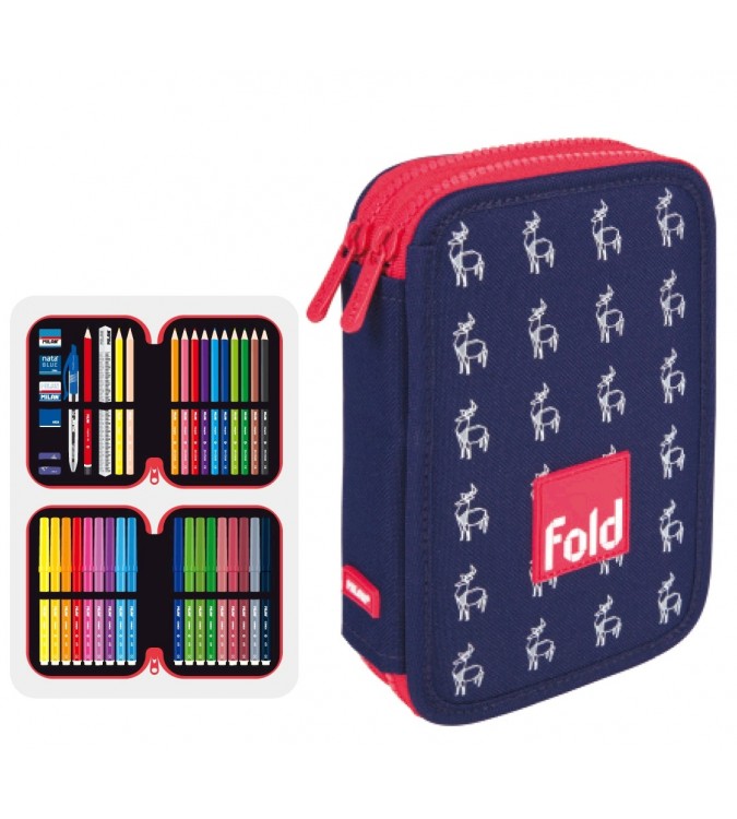 Plumier 2 pisos . Tejido: poliéster. Contenido: 18 rotuladores punta cónica, 12 lápices de colores triangulares, lápiz de grafito HB, bolígrafo P1 azul, regla 15cm, sacapuntas AFILA y 2 gomas de borrar MILAN.