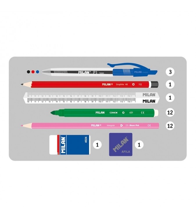 1 sacapuntas Basic, 1 regla de 15cm, 1 lápiz de grafito HB y 1 goma de borrar de miga de pan MILAN.