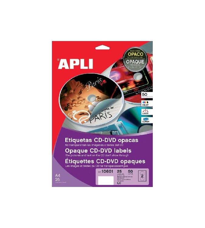 Etiquetas apli para cd-dvd exterior.ø 117 interior. Ø 18 inprimibles en inkjet, láser y fotocopiadoras formato a4