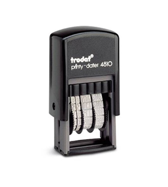 Sello fechador de entintaje automático con caracteres de 3.8 mm. Las almohadillas están disponibles en color azul, negro y rojo.