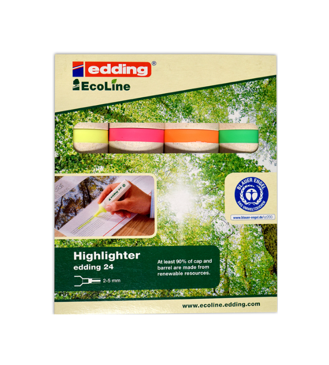 El resaltador edding 24 cuenta con una variedad de características ecológicas. Al menos el 90 % del capuchón y el cuerpo están fabricados con materiales renovables, mientras que la boquilla y las fibras del filtro están fabricados casi en su totalidad con materiales reciclados. Además, el marcador es recargable, lo que prolonga significativamente su vida útil y ayuda a evitar el desperdicio. El iluminador edding 24 EcoLine también ha sido galardonado con la etiqueta ecológica Blue Angel. Está disponible en cinco vibrantes colores neón y es adecuado para su uso en casi todos los tipos de papel. El producto es parte de la gama de productos EcoLine, climáticamente neutral, que en el pasado recibió el premio German Ecodesign Award y ganó el premio Green Brand Germany Award en varias ocasiones.