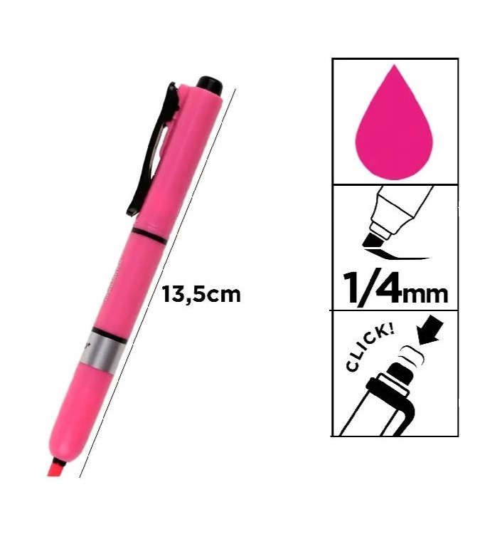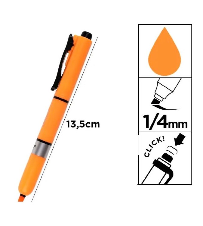 Rotulador fluorecescente retráctil sistema click, cuerpo tipo bolígrafo de plástico del color de la tinta.