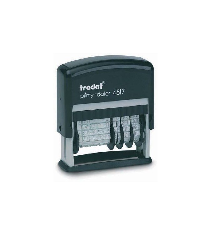 Sello formulario-fechador de entintaje automático. Caracteres de 3,8 mm. Contiene 12 textos: recibido, facturado, pagado, cobrado, despachado, por fax, entregado, revisado, conforme, impresos, duplicado, urgente.