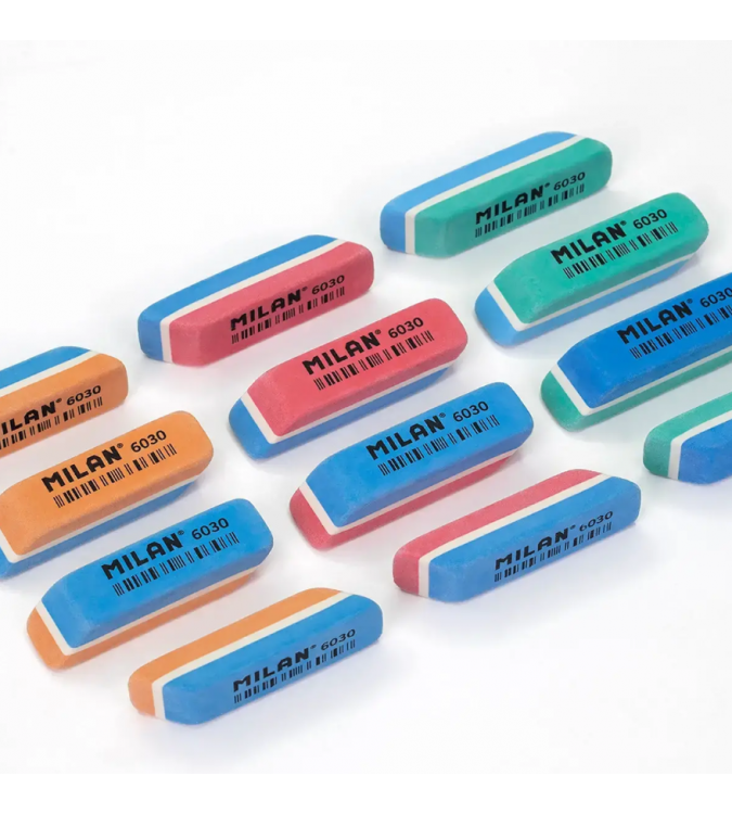 Goma de caucho sintético flexible biselada y bicolor, para borrar lápiz sobre todotipo de superficies.