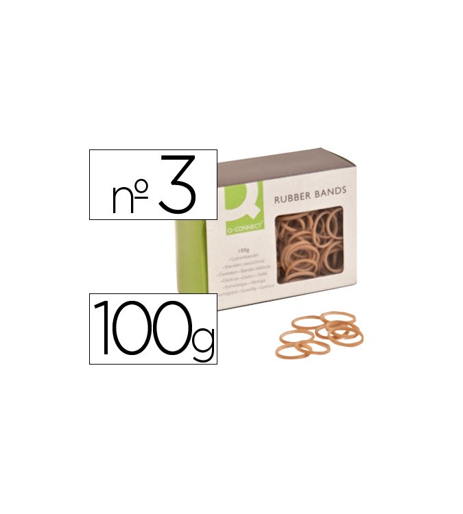 Gomillas elasticas q-connect 100 gr numero 3 30 x 2 mm. 80 % caucho de alta calidad y resistencia. Ancho de 2 mm. Su presentaciónen caja facilita su conservación y almacenamiento.
