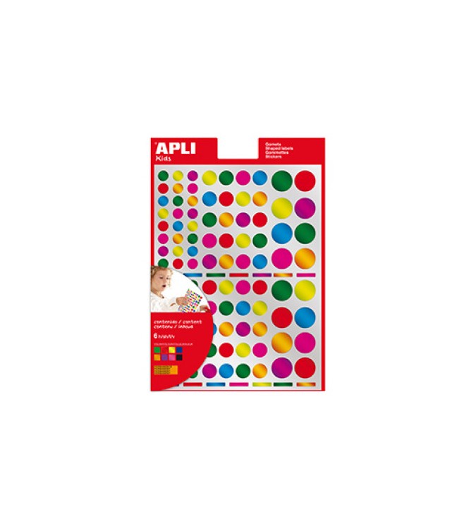 Bolsa de gomets redondos con adhesivo permanente en diferentes colores con acabado metalizado: verde, naranja, rosa, azul, rojo, lila y amarillo. Tres tamaño surtidos: Ø 10 mm, Ø 14 mm y Ø 20 mm. Cada bolsa contiene 6 hojas con gomets surtidos, un total de 624 gomets por bolsa. Un producto indispensable en cualquier hogar y escuela. Antes de aprender a manejar el lápiz o las pinturas, con estos gomets, los niños pueden ir iniciándose en el mundo de los colores y las formas. Jugar y crear con gomets es una actividad básica que permite desarrollar la psicomotricidad fina y trabajar, al mismo tiempo, varias capacidades y habilidades como el conocimiento de los colores, las formas geométricas y los tamaños; el desarrollo de la lógica y la creatividad; el trabajo en equipo o el dominio del espacio, entre otros. Además, los gomets APLI cumplen con las más estrictas normas de calidad y seguridad: - Se fabrican conforme a las normas EN-71 y a la cadena de custodia FSC - Adhesivo base agua - Libre de disolventes - Papeles ECF (Elemental Chlorine Free) - Materiales 100% reciclables