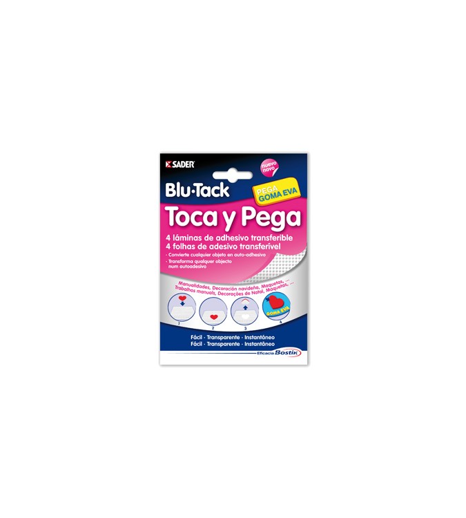 Sujetacosa masilla bostik toca y pega blu tack laminas adhesivas transferible contine 4 laminas. Toca y pega son 4 láminas impregnadas de adhesivo transparente. Este adhesivo es transferido a cualquier objeto con el que entre en contacto. De este modo el objeto se convierte en auto adhesivo. Ideal para pegar pequeñassuperficies de goma eva y sobre gran cantidad de materiales.