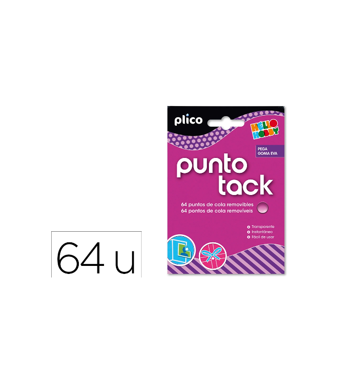 Punto tack son pequeñas gotas de adhesivo transparente removible que se pegan sobre cualquier superficie, como papel, cartón, madera, plástico, metal e incluso superficies pintadas. Ideal para manualidades con goma eva, envolver regalos, pegar lazos, pegar fotos en álbumes, manualidades, collage, etc. Contiene: 64 puntos de cola removibles. |