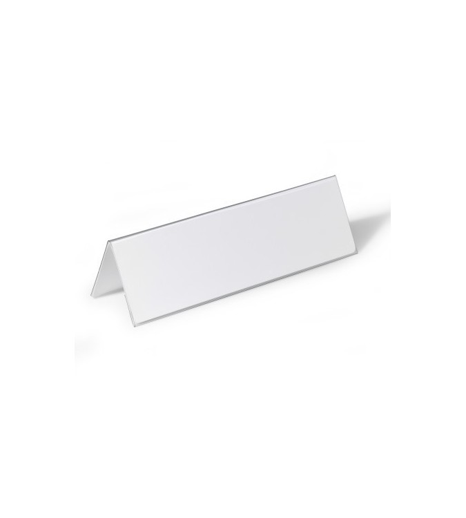 Ideal para conferencias, seminarios, recepciones y mostradores. Impresión sencilla y profesional con el software que se descarga gratuitamente de la página web www.durable.eu. Legibles por ambos lados. Diseño estable con forma de tejado. Con etiquetas en blanco intercambiables con marco decorativo. Tamaño de la etiqueta: 105/210 x 297 mm.