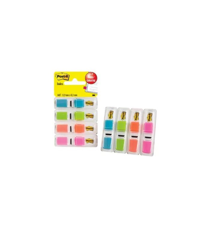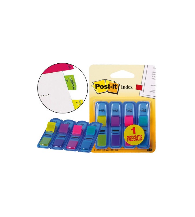 Banderitas señalizadoras post-it 3+1 gratis clipstrip. Ideales para codificar por colores, marcar y localizar. 3 dispensadores +1 gratis. Cuatro dispensadores (35 de cada color). Material plástico. Medidas: 12 x 43,1 mm.