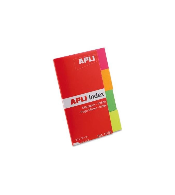 Indices marcadores notas adhesivas bloc de 4x40h medidas 20x50mm colores amarillo, rosa, verde y naranja.