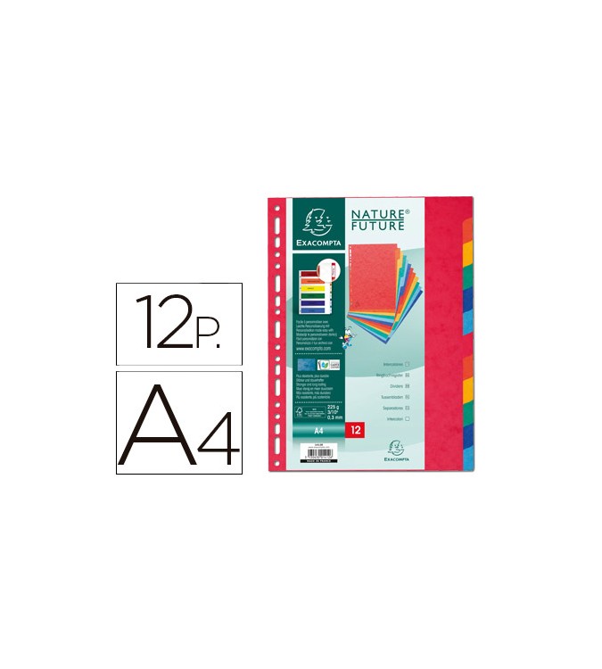 Juego de separadores fabricados en símil prespán de 225 g/m² en colores vivos. Con suave ilustración. Muy resistentes. Multitaladro. Incluye página de índices. |