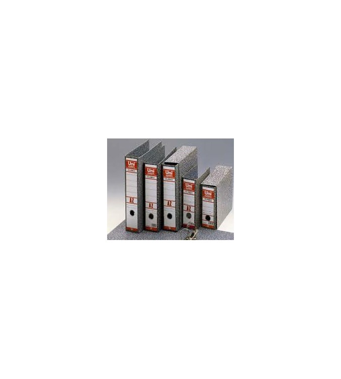 Archivadores de cartón forrados en papel jaspeado. Mecanismo niquelado. Con cantoneras. Lomo de 70mm. Caja incorporada.