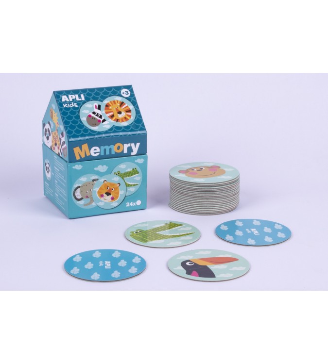 Memory de 24 piezas tamaño Ø 8 cm con un total de 12 parejas de divertidos animales con dibujos infantiles de fácil reconocimiento para los niños. Juego presentado en una caja de cartón en forma de casita.