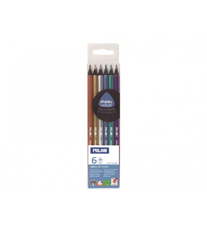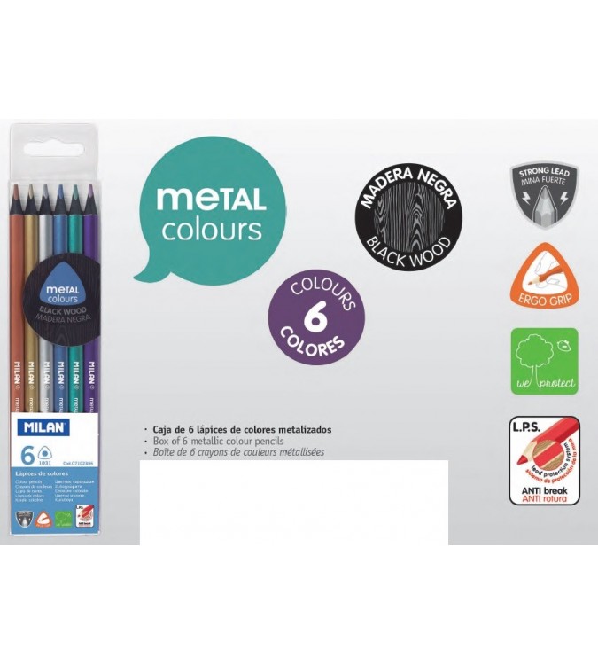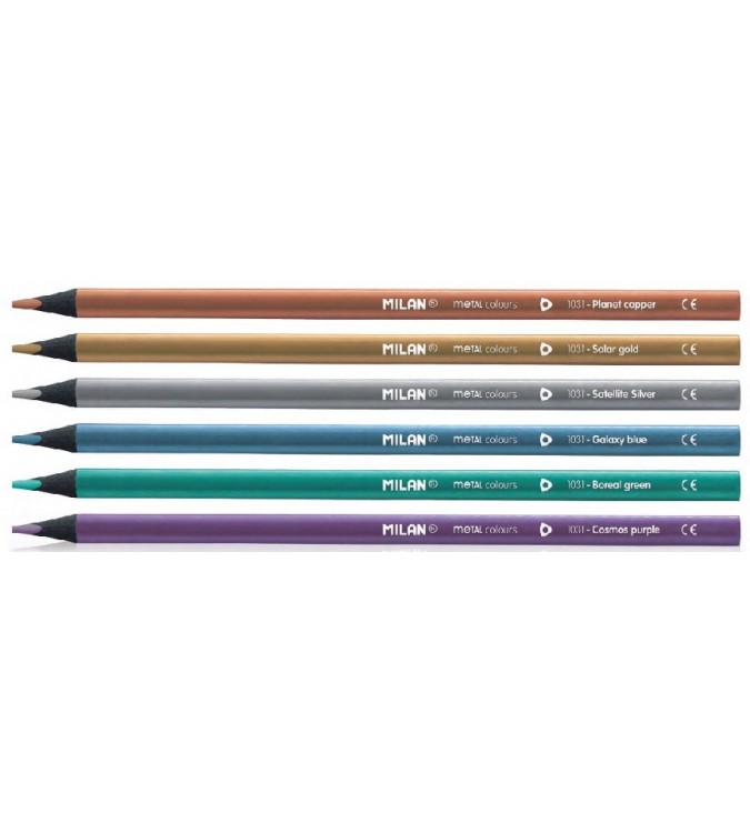 Lápices de colores metalizados con madera de tilo en color negro. Mina de 2,9 mm Ø. Forma triangular ergonómica. La mina ofrece un trazo uniforme y es resistente a la rotura, gracias al sistema LPS (Lead Protection System) que protege la mina gracias a su adhesión con la madera. Madera procedente de plantaciones sostenibles. 6 colores metalizados: cobre, oro, plata, azul, verde, lila. Colores con nombre propio: Planet Copper, Solar Gold, Satellite Silver, Galaxy Blue, Boreal Green, Cosmos Purple.