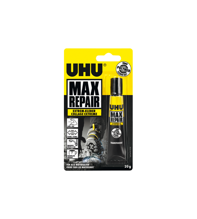 UHU Max Repair es un pegamento extremadamente fuerte y flexible apto para casi todos los trabajos de reparación en interiores y exteriores. Adecuado para materiales porosos y no porosos. Resistente al agua (también al lavavajillas), posee poder de relleno y se puede pintar encima una vez seco. Resiste las vibraciones, golpes, temperaturas de