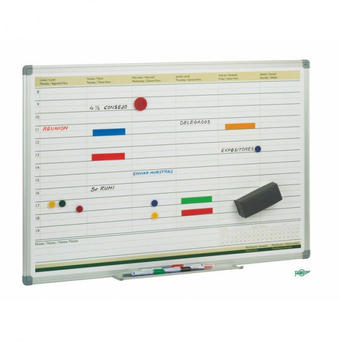 PIZARRAS PARA PLANIFICACIÓN METÁLICAS Superficie impresa a dos colores, útil tanto para trabajar con imanes, como para escribir con rotuladores especiales para pizarra blanca. Marco de aluminio y cantoneras decorativas. Suministradas con cajetín de aluminio de 40 cm. y elementos de fijación. Permite la planificación semanal, al estar dividido en días y horas. Además de un amplio espacio para notas en su parte inferior. 100% Reciclable Medidas: 60×90 cm. Caja individual. Certificadas según norma UNE 11016:89 Imprescindible fijar los cuatro puntos de anclaje, para garantizar la SEGURIDAD de la instalación. Se recomienda realizar el mantenimiento adecuado de la superficie, para mantenerla en un perfecto estado de uso.