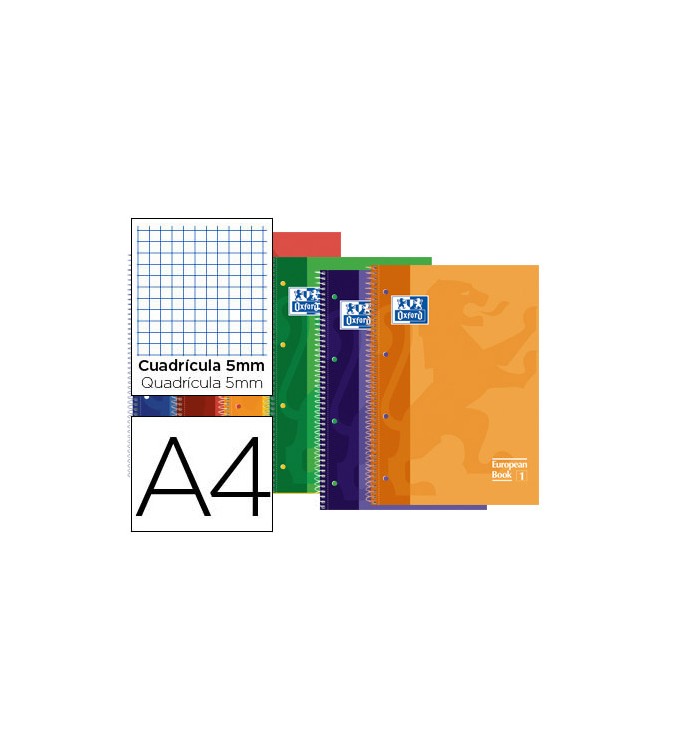 Bloc espiral Oxford tapa extradura microperforado Din A4 80 hojas cuadros 5mm colores surtidos.