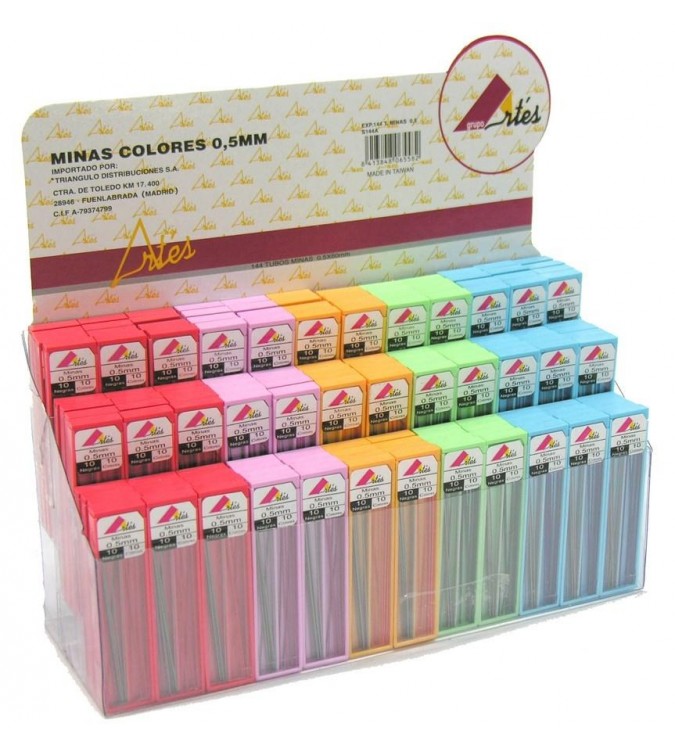 Tubos de minas de 0.5 mm. Cada tubo tiene 10 minas de color y 10 negras. Colores: rojo, verde, naranja, azul, fucsia