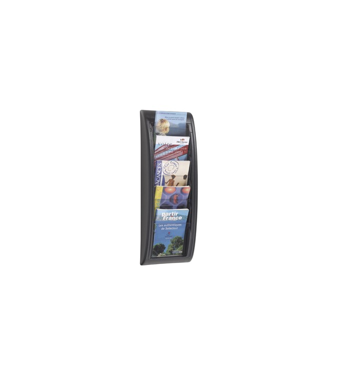 Expositor mural fast-paperflow din a5 negro 5 casillas 650x228x95 mm. Expositor mural con sistema quick fit. Monobloque, fabricado en poliestireno de alto impacto negro. Baldas transparentes.