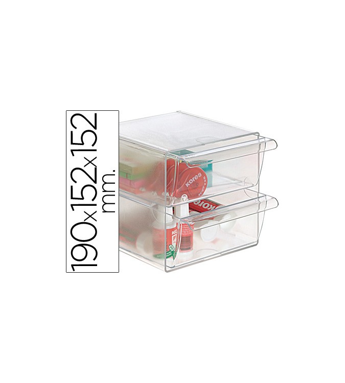 Archicubo archivo 2000 2 cajones organizador modular plastico 190x152x152 mm incluye 2 clips de sujecion. Organizadores modulares fabricados en poliestireno inyectado transparente de gran calidad y brillo. Permite unirlos y apilarlos en vertical y horizontal o con distintas combinaciones de cajones mediante clips de sujecion (2 por modelo). Ideal para organizar pequeño material de oficina, blocs de notas, boligrafos, cds, en estanterias y armarios. Cajones extraibles y de apertura independiente.