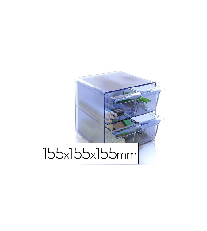 Archicubo archivo 2000 4 cajones organizador modular plastico azul transparente 155x155x155 mm. Organizadores modulares fabricados en poliestireno inyectado transparente de gran calidad y brillo. Permite unirlos y apilarlos en vertical y horizontal o con distintas combinaciones de cajones mediante clips de sujecion (2 por modelo). Ideal para organizar pequeño material de oficina, blocs de notas, boligrafos, cds, en estanterias y armarios. Cajones extraibles y de apertura independiente.