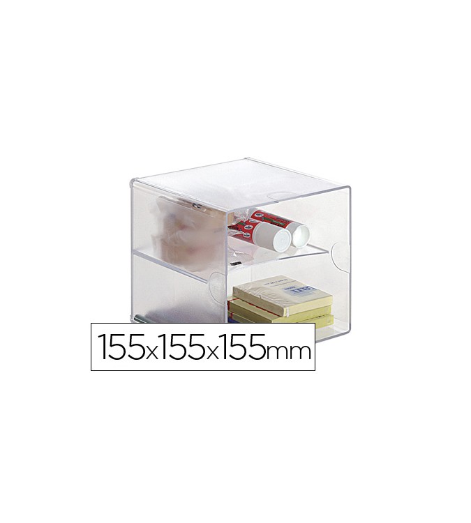 Archicubo archivo 2000 con 2 separadores organizador modular plastico 155x155x155 mm. Organizadores modulares fabricados en poliestireno inyectado transparente de gran calidad y brillo. Permite unirlos y apilarlos en vertical y horizontal o con distintas combinaciones de cajones mediante clips de sujecion (2 por modelo). Ideal para organizar pequeño material de oficina, blocs de notas, boligrafos, cds, en estanterias y armarios. Cajones extraibles y de apertura independiente.