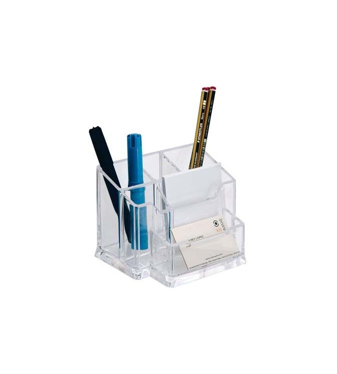 Organizador con 6 compartimentos: 1 para taco de papel (incluido) + 4 para reglas, bolígrafos, lápices… + 1 para tarjetas de visita. Color transparente 155 x 105 x 100 mm (fondo x ancho x alto)