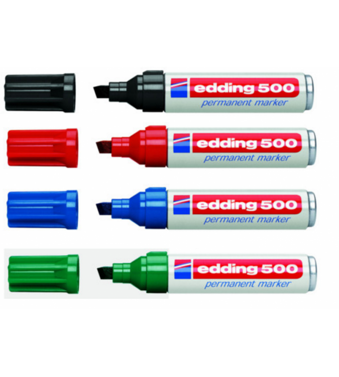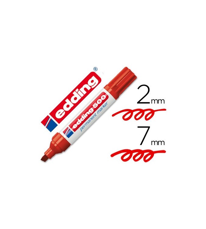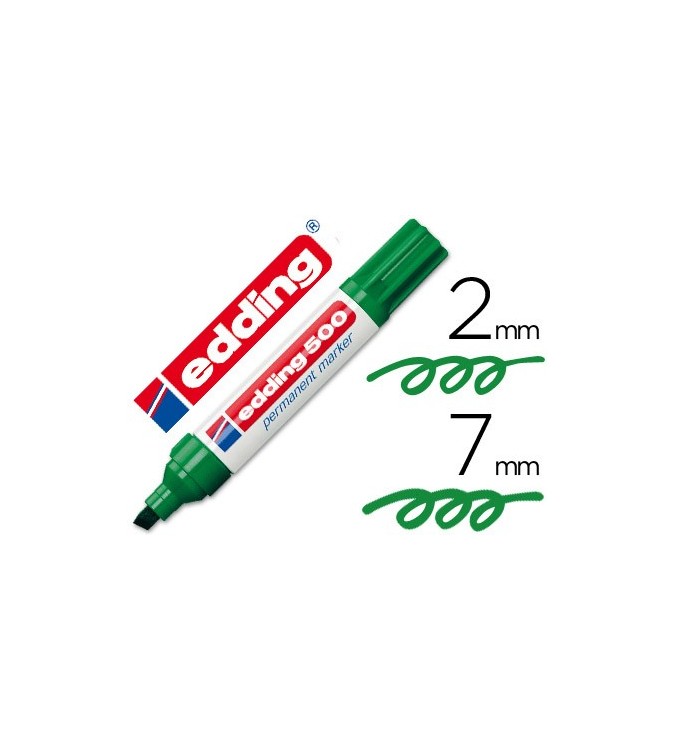 Marcador edding 500 punta sintética, tinta de secado rápido, resistente a la luz, al roce y al agua. Sin olor. Punta biselada. Trazo 2 a 7 mm.