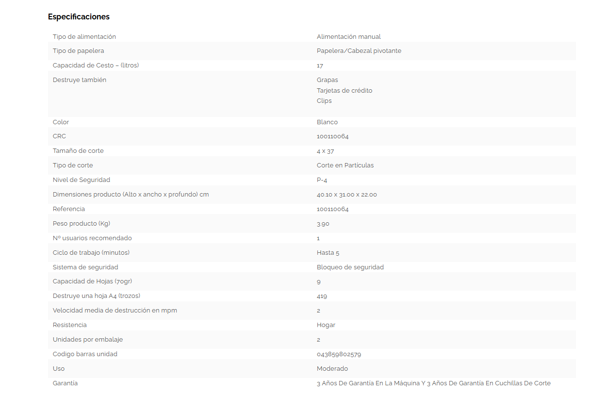 • Destruye hasta 9 hojas en partículas de 4x37 mm (Din P-4)