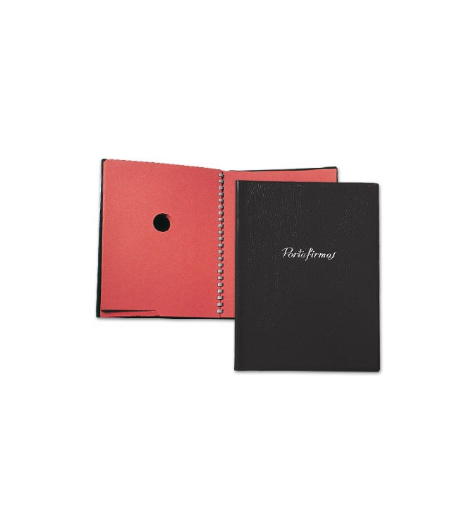 Portafirmas saro 320 negro. Plástico pvc gofrado de alta calidad. Exterior color negro. Interior con wire-o. 20 departamentos. Cartulina con escalerilla color rojo. Tamaño folio.