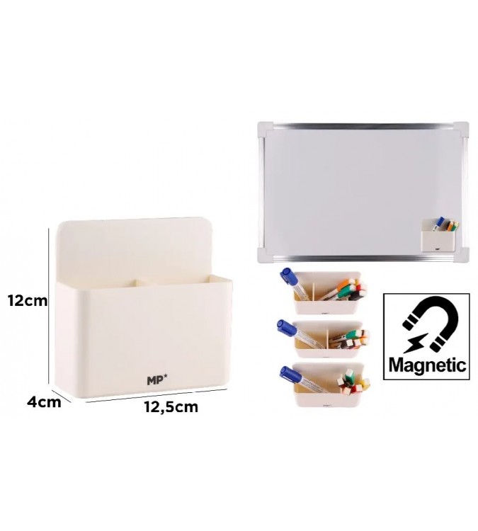 Recipiente rectangular imantado para pizarras magnéticas. Ideal para poner los rotuladores, el borrador, y tenerlo todo a mano. Color blanco. Medidas: 12 x 4 x 12,5 cm.