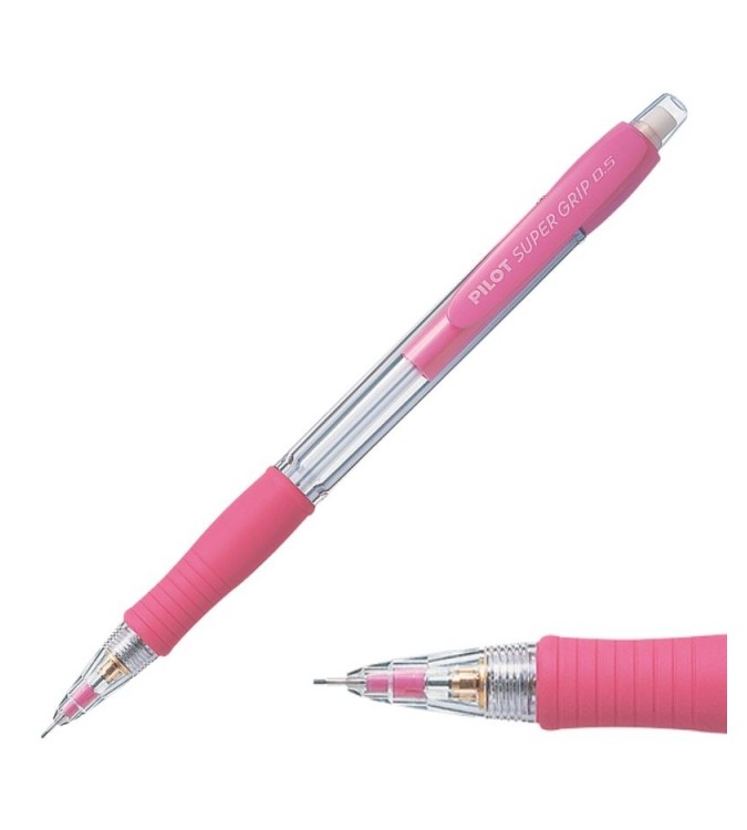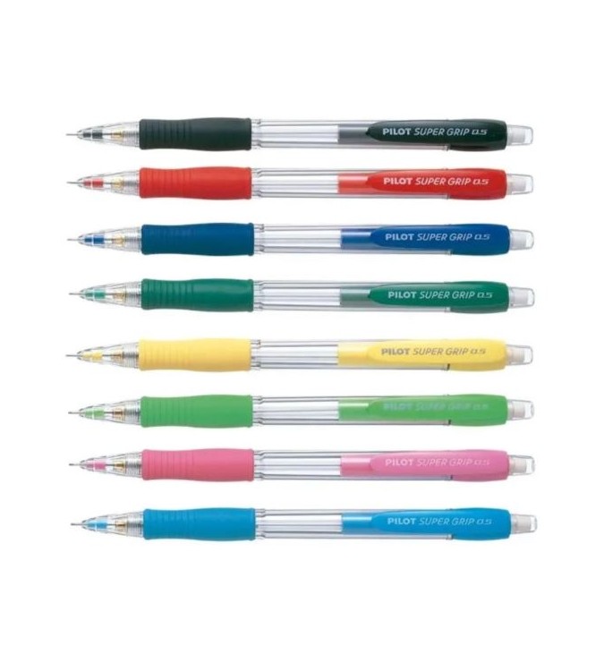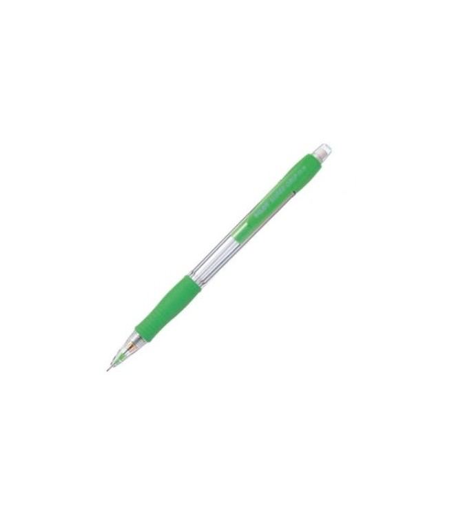 Portaminas 0,5mm en cuerpo de plástico transparente en diferentes colores, con goma. Grip en la parte inferior.