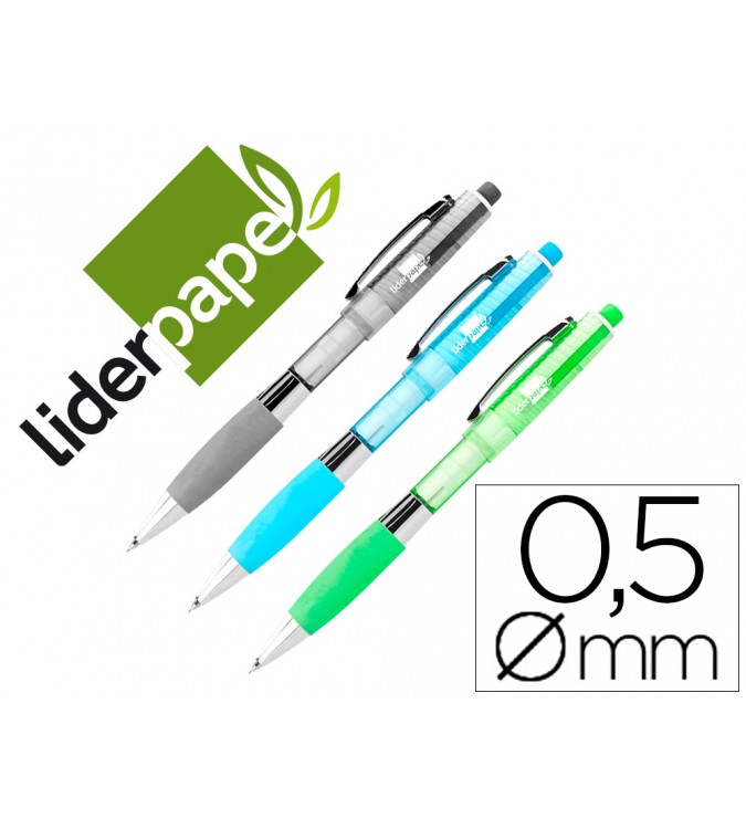 Portaminas con cuerpo de plástico. Sujeción suave. Con goma. Colores surtidos. Minas de 0,5 mm incluidas.