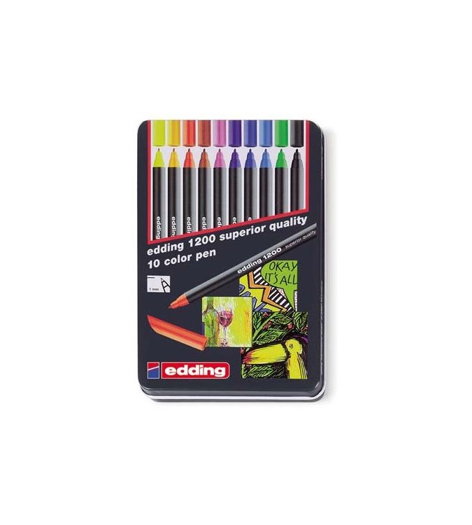 Estuche de metal con 10 rotuladores de calidad superior con punta resistente en colores brillantes, tinta base al agua.