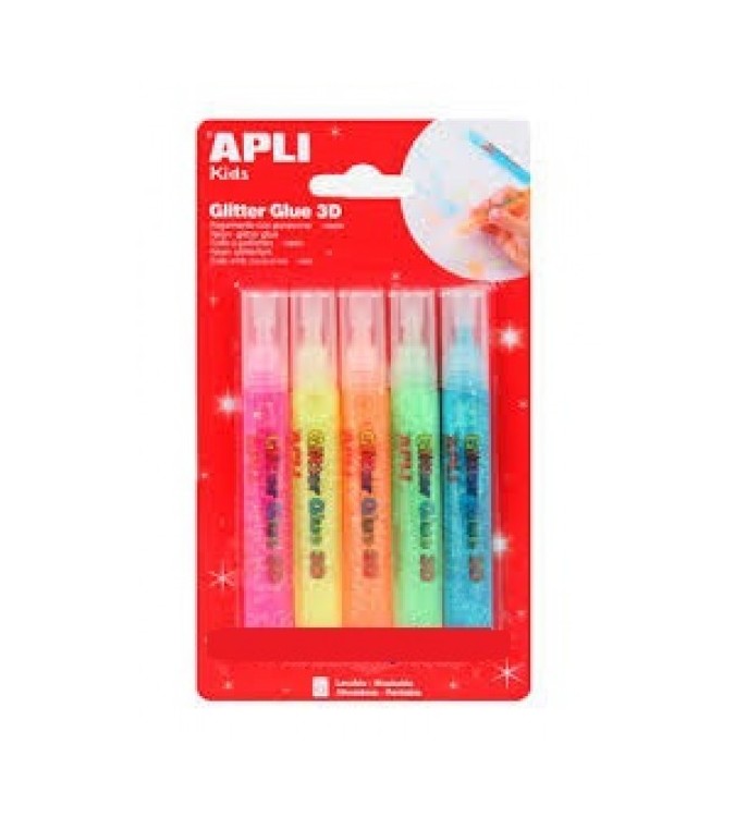 Pegamento con purpurina neon. Contenido 5 tubos de 13 ml. Rosa, Amarillo, Naranja, Verde, Azul. Labable a máquina con programas de agua caliente.