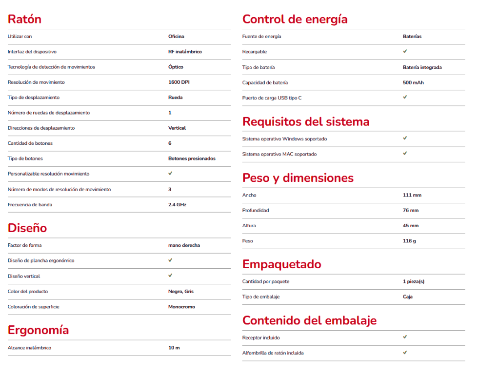Optical, 1000/1200/1600 DPI, RF wireless 2.4 GHz, 500 mAh, USB type-C, 111 x 76 x 75 mm, 116 g