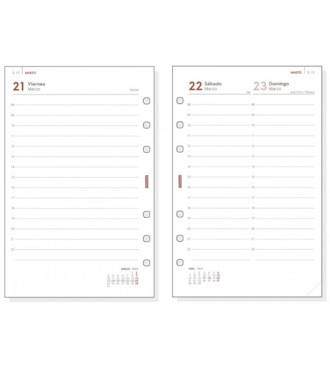 • Duración agenda/calendario: 12 meses 1 día página (enero-diciembre) + 2 meses resumidos quincena a la vista (un mes QV antes del inicio de la anualidad y otro mes al finalizar la anualidad).