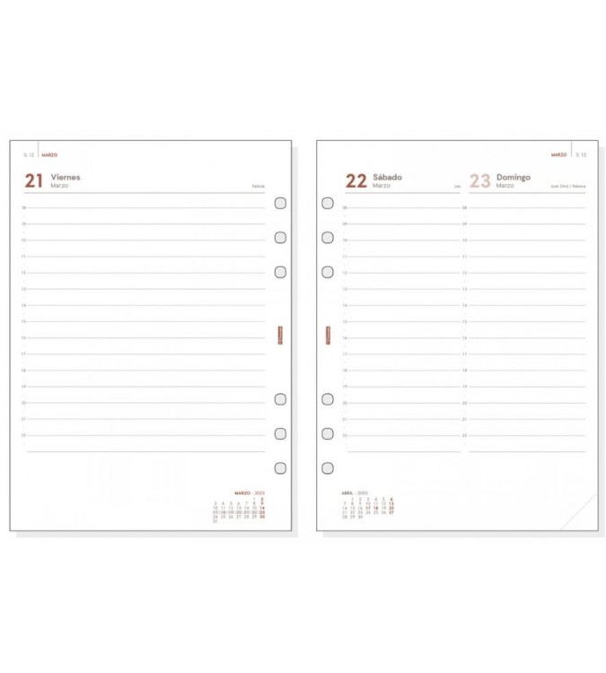 • Duración agenda/calendario: 12 meses 1 día página (enero-diciembre) + 2 meses resumidos quincena a la vista (un mes QV antes del inicio de la anualidad y otro mes al finalizar la anualidad).