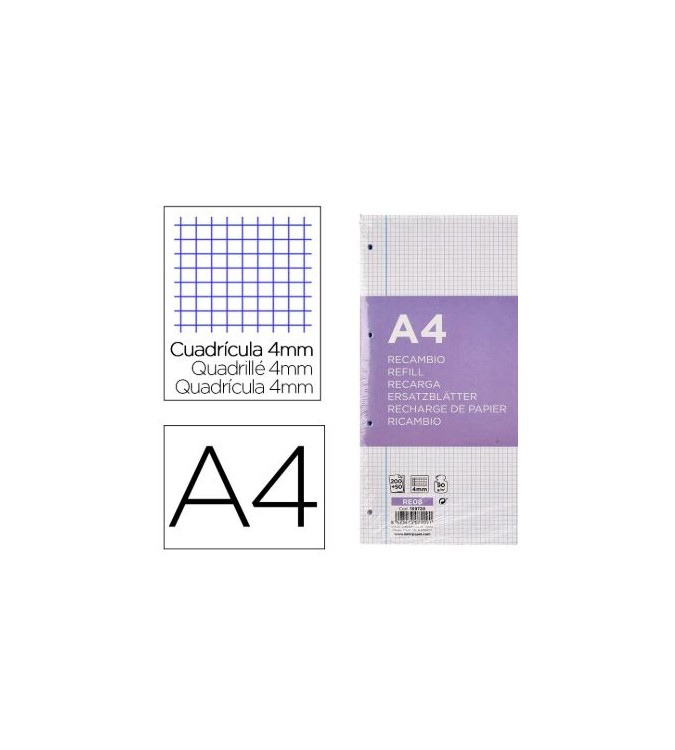 RECAMBIO A4 CUADRO 4X4 90 GR. 100 HOJAS 4 ANILLAS.