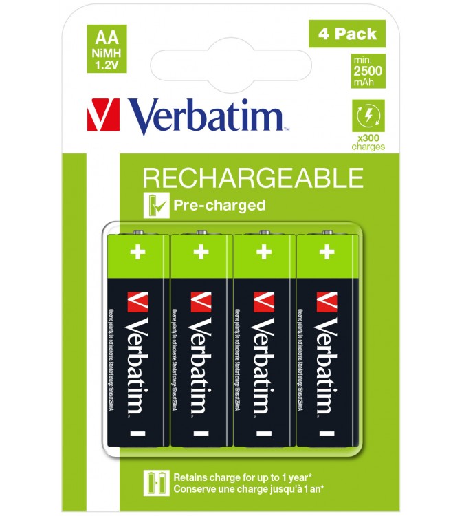 PILAS RECARGABLES VERBATIM AA LR6 HR6 2500 mAh 1.2V 4 UNIDADES