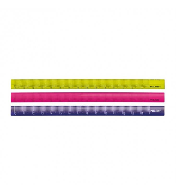 Reglas triangulares de 15 cm de plástico transparente. Colores: amarillo, azul y rosa translúcido.