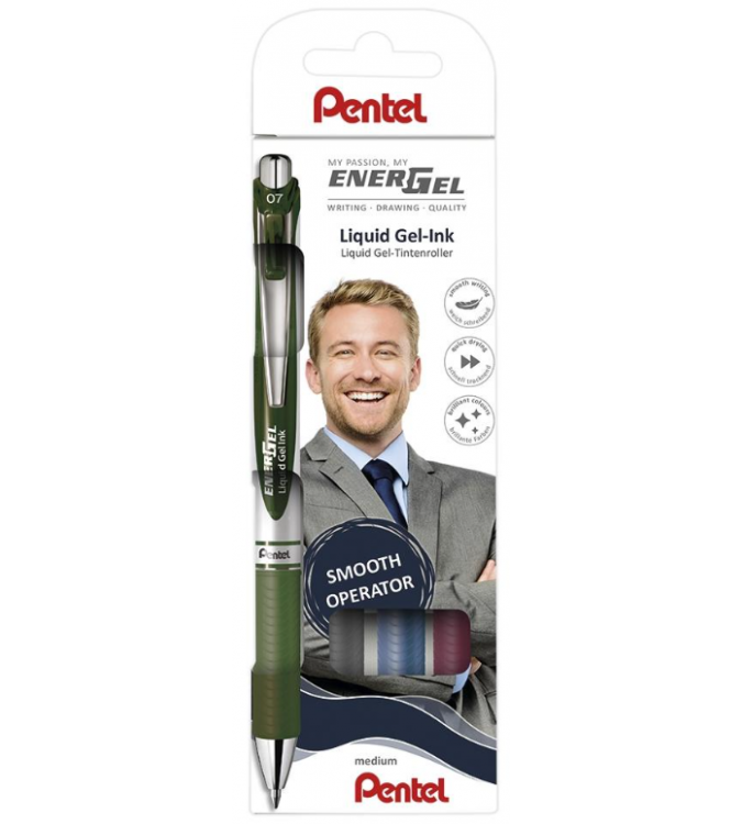 Estuche de 4 unidades de bolígrafo Energel retráctil con punta de bola. Escritura en color negro, burgundy, azul oscuro y verde campo.