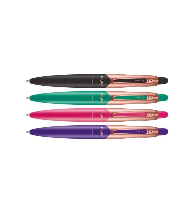 Bolígrafo CAPSULE Copper tinta azul. Longitud de escritura aproximada de 1.000 metros. Punta 1 mm. Tinta fabricada en Alemania. Pulsador con retorno. Diseño original creado por el departamento de I+D de MILAN. Medidas bolígrafo: 13,4 x 1,6 cm. 1,4 cm Ø. Colores surtidos