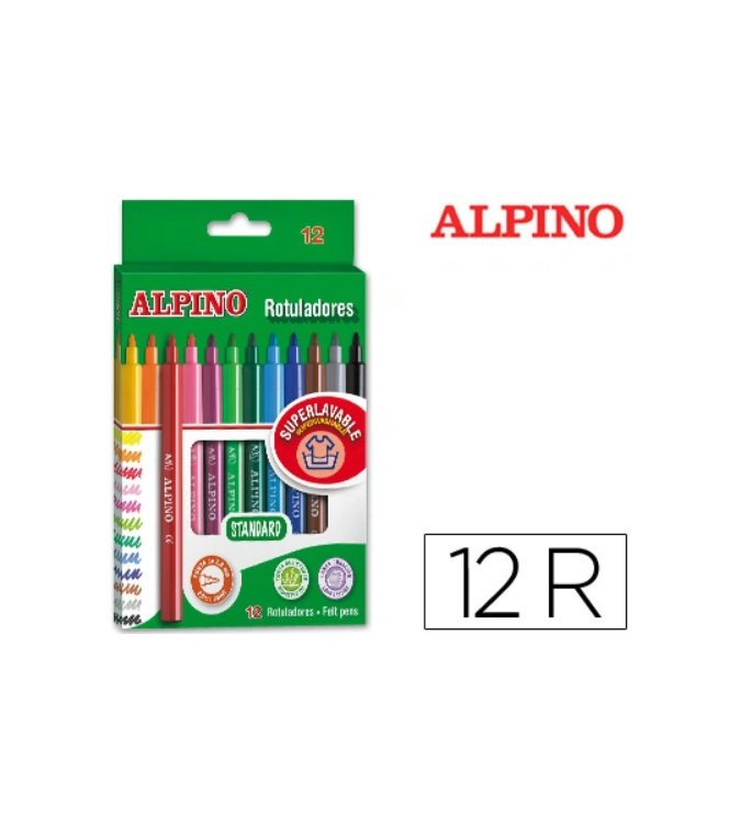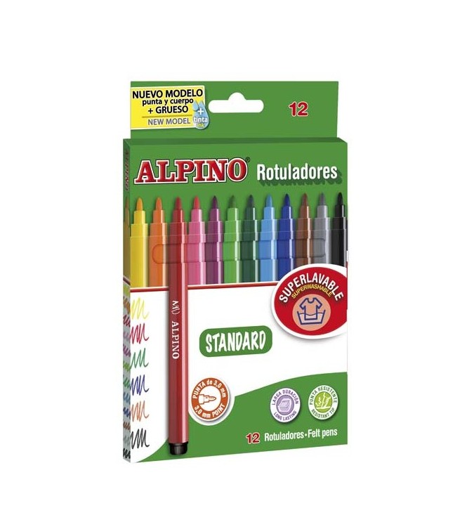 Estuche de 12 rotuladores escolares de punta fina 3 mm. Súperlavables y de colores brillantes.