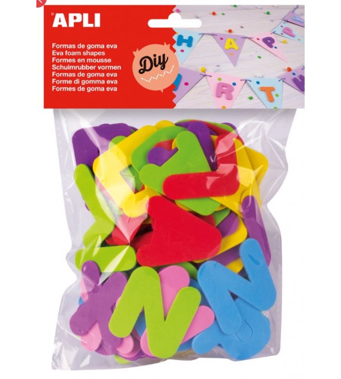 Letras de goma EVA en colores surtidos: rojo, verde, azul, amarillo, lila y rosa. Cada forma tiene una altura aproximada de 50 mm. Cada bolsa contiene 104 formas. Ideales para utilizar tanto en casa como en la escuela en manualidades, álbumes, tarjetas de felicitación, etc. Excelente herramienta para que los más pequeños empiecen a familiarizarse con las letras y crear palabras, con un material suave y seguro.