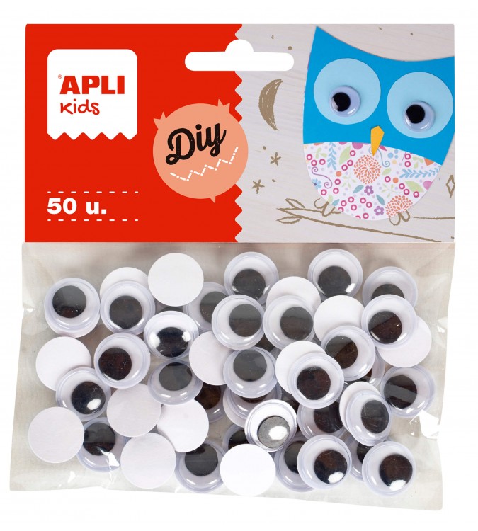 Ojos móviles adhesivos redondos de color negro. Medida: Ø 15 mm. Cada bolsa contiene 50 ojos.