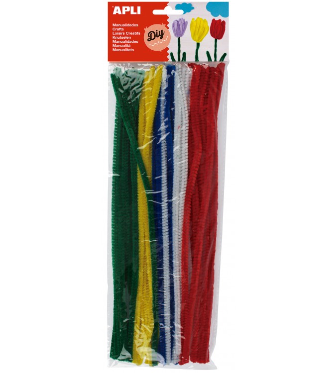 Limpiapipas para manualidades de colores surtidos: verde, amarillo, azul, blanco y rojo. Medida: Ø 6 mm x 300 mm. Cada bolsa contiene 50 limpiapipas. Limpiapipas flexibles, suaves, tupidos y de fácil manipulación. Producto básico para escuelas y talleres infantiles, ideales para crear decoraciones, construcción de estructuras, peinados, muñecos, joyas o usar en otras manualidades. Ideales para estimular la imaginación y creatividad de los niños, así como para desarrollar la psicomotricidad fina.