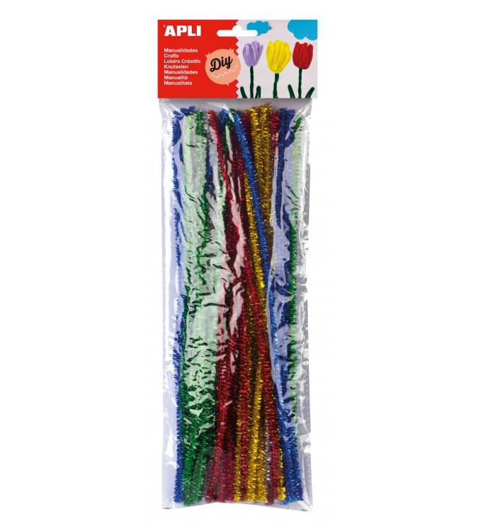 Limpiapipas brillantes para manualidades de colores surtidos: azul, verde, rojo, oro y plata. Medida: Ø 6 mm x 300 mm. Cada bolsa contiene 50 limpiapipas. Limpiapipas flexibles, suaves, tupidos y de fácil manipulación. Producto básico para escuelas y talleres infantiles, ideales para crear decoraciones, construcción de estructuras, peinados, muñecos, joyas o usar en otras manualidades. Ideales para estimular la imaginación y creatividad de los niños, así como para desarrollar la psicomotricidad fina.